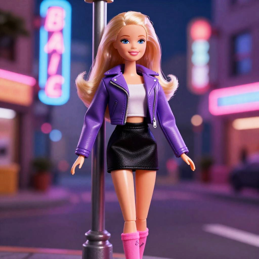 Photorealistic CGI image of a blonde Barbie doll with blue eyes, standing in a neon-lit urban street at night. She wears a purple leather jacket, white crop top, black leather skirt, and pink knee-high socks. Her long, wavy hair is styled with a headband. The background features blurred neon signs in pink, blue, and orange, with a dark, starry sky. The street is empty, with faint streetlights and building outlines visible. The doll's expression is cheerful, with a slight smile. The overall style is vibrant and modern, with a focus on the neon cityscape.
