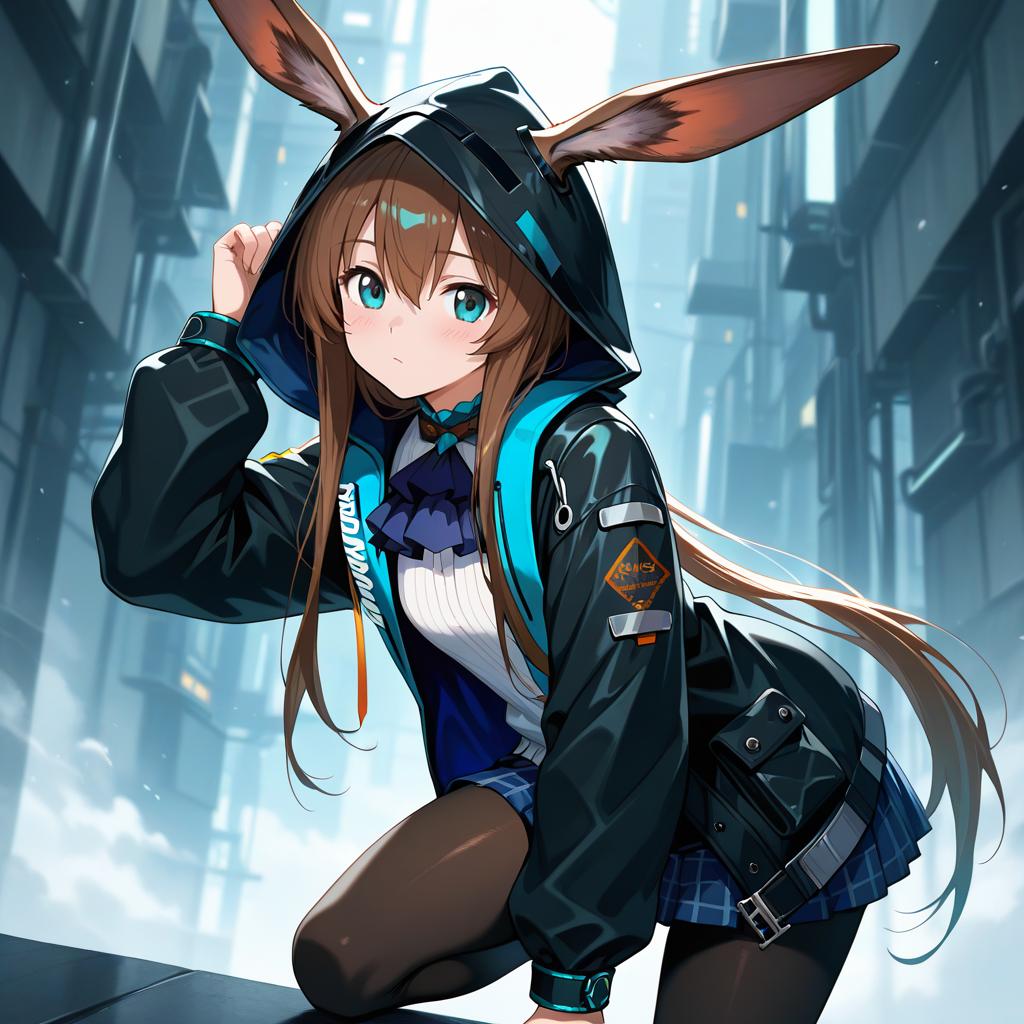 Amiya (guard) (arknights), arknights, 1girl, rabbit ears, blue eyes, hair between eyes, brown hair, long hair, very long hair, ponytail, sidelocks, open jacket, white shirt, black jacket, hooded jacket, blue skirt, black pantyhose, long sleeves, hood up, rabbit girl, by artist kiriya (552260), illustrious