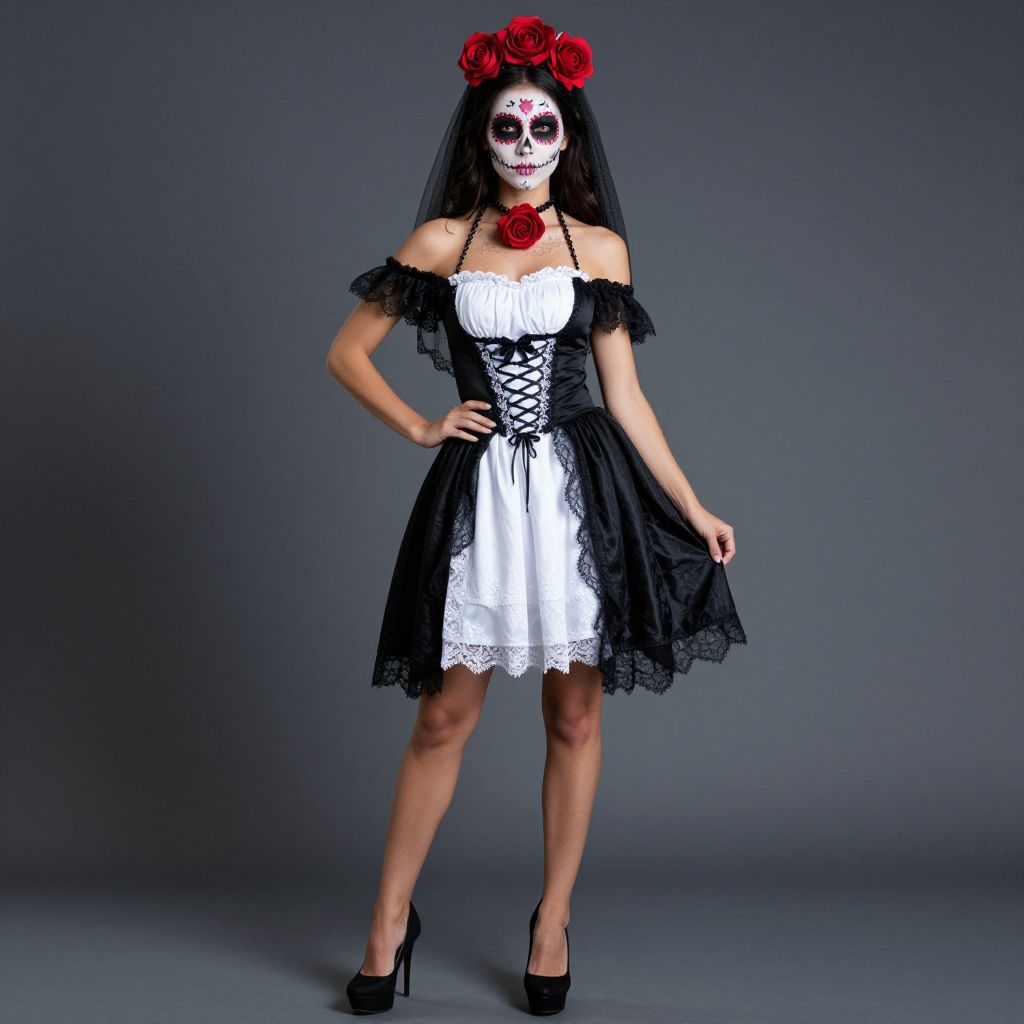 Photograph of a young woman in a Day of the Dead costume. She wears a black and white off-the-shoulder dress with lace trim, a corset-style lace-up back, and black high heels. Her face is painted white with black intricate designs, and she has a red flower in her hair. She stands against a plain gray background with one hand on her hip and the other holding the sides of her dress. Her long black hair is styled down, and she wears a black veil. The image has a dark, gothic aesthetic with contrasting colors and textures.