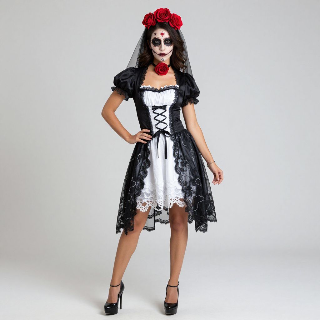 Woman modeling a striking Adult Mexican Day of the Dead Zombie Bride Ladies Halloween Fancy Dress Costume, featuring a black and white ensemble with lace detailing, a red rose necklace, and a matching headpiece adorned with three vibrant red roses, complemented by skeleton makeup and high heels.