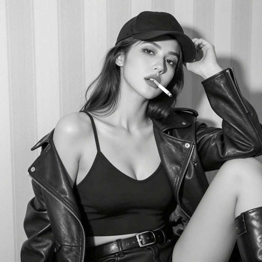 Black and white photograph of a woman with long dark hair, wearing a cap, black leather jacket, and deep neckline black top. She has a cigarette in her mouth, hand resting on her head, looking directly at the camera. She has large breasts, and the jacket is partially off her shoulders. Vertical striped wallpaper in the background. She is sitting with one leg visible. Intense facial expression.