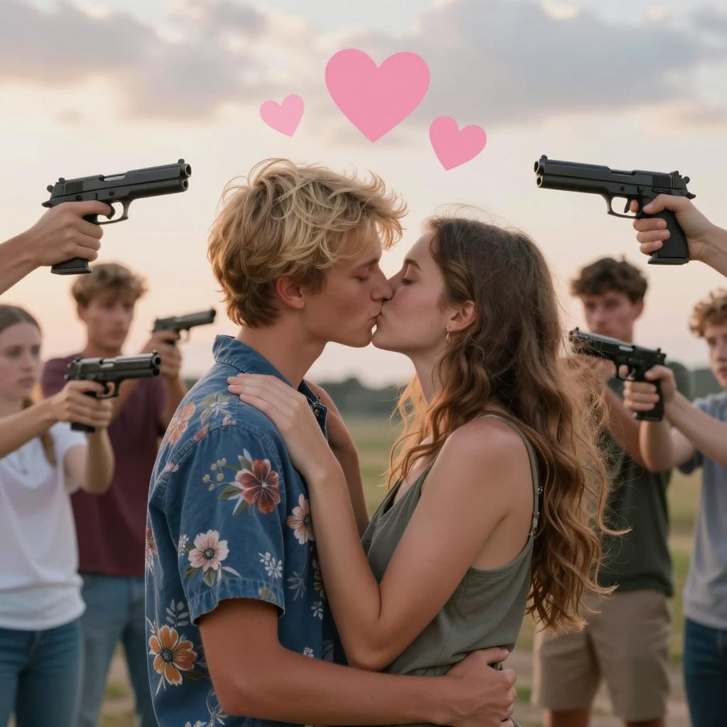Photograph of a young couple kissing. Boy in blue floral shirt, girl in green tank top. Surrounded by multiple people holding guns, aiming at them. Pink heart above their heads. Background has cloudy, orange sky. Intense expressions on gun-wielding figures. Boy's blond hair, girl's brown hair. Boy's right hand on girl's waist.