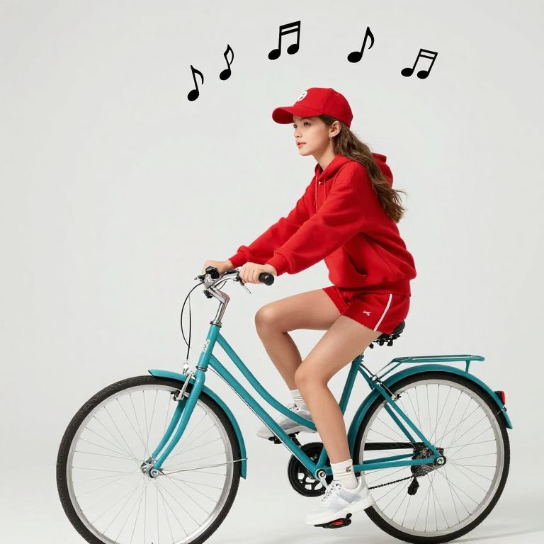 Fashionable girl riding a teal bicycle, adorned with vibrant red attire and a matching cap, surrounded by floating musical notes that dance above her head.