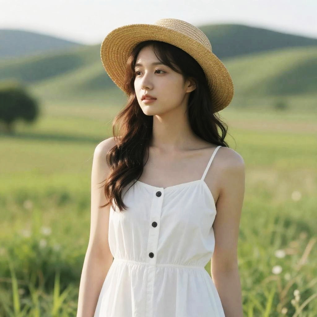 Photograph of a young woman with fair skin and dark brown, wavy hair, wearing a wide-brimmed straw hat and a white, sleeveless sundress with thin straps and small black buttons. She stands in a lush green meadow with rolling hills and trees in the background. The sunlight casts a soft glow, highlighting her serene expression and natural beauty.