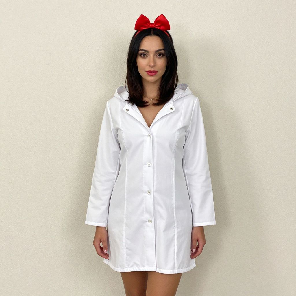 Secy Snow White Costume, woman in white coat and hood standing against a wall