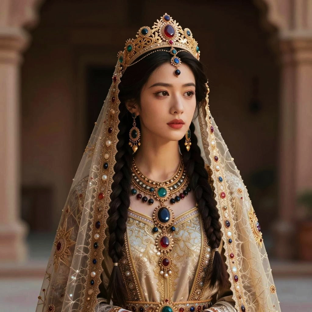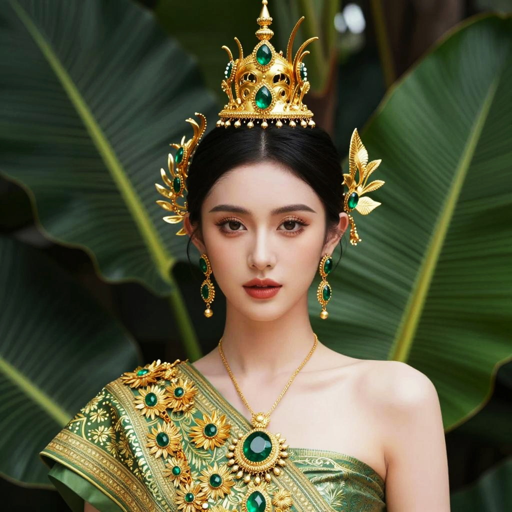 A stunning woman adorned with an elaborate gold and emerald headdress, matching earrings, and an intricate necklace, set against a lush backdrop of green tropical leaves. The image combines vibrant green and gold tones with a rich, luxurious style that evokes a regal and exotic atmosphere.