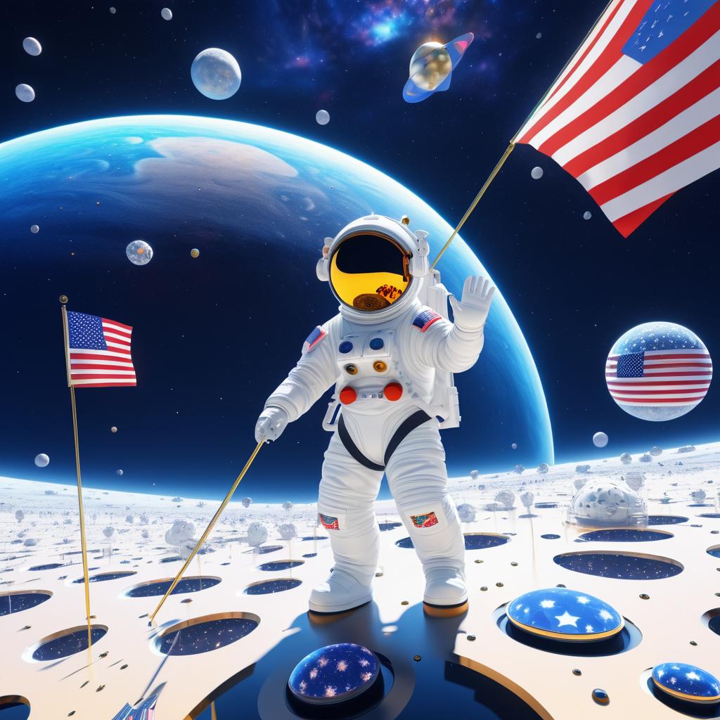 Digital 3D render of two astronauts standing on an alien landscape with large black polka dots, one prominently holding a United States flag. The space environment includes distant planets and a dark starry sky. The astronauts wear white space suits with gold visors and American flag patches, conveying a futuristic and surreal exploration scene.