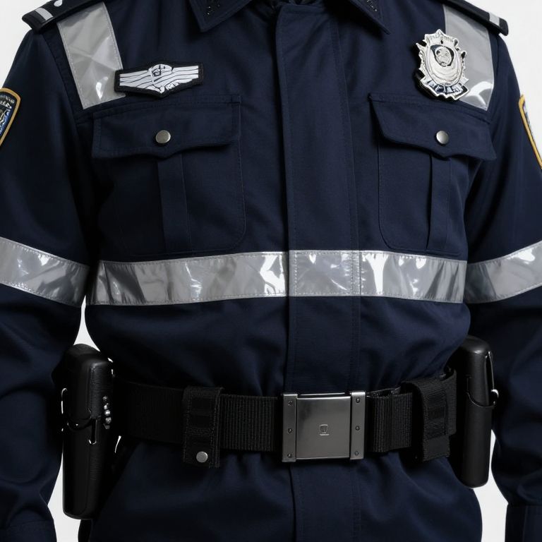 Police dress prompt: Close-up of a police officer's official uniform with reflective details, including a polished coat, rank insignia, and a tactical belt, captured in high-definition with subtle reflections under studio lighting.