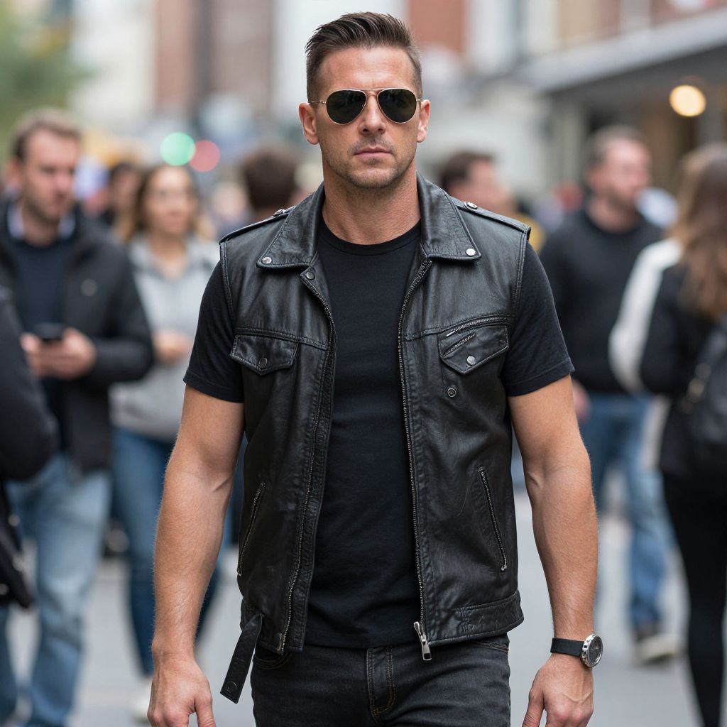 Photograph of a muscular Caucasian man with short, dark brown hair, wearing black aviator sunglasses and a black leather vest over a black t-shirt. He has a neatly trimmed beard and wears a black wristwatch. The background is a blurred city street with several people, some walking, some standing, wearing casual clothing. The lighting is natural, with a mix of soft and bright spots from streetlights and windows. The man's confident, slightly stern expression is centered in the frame, with a shallow depth of field that emphasizes his sharp, stylish appearance.