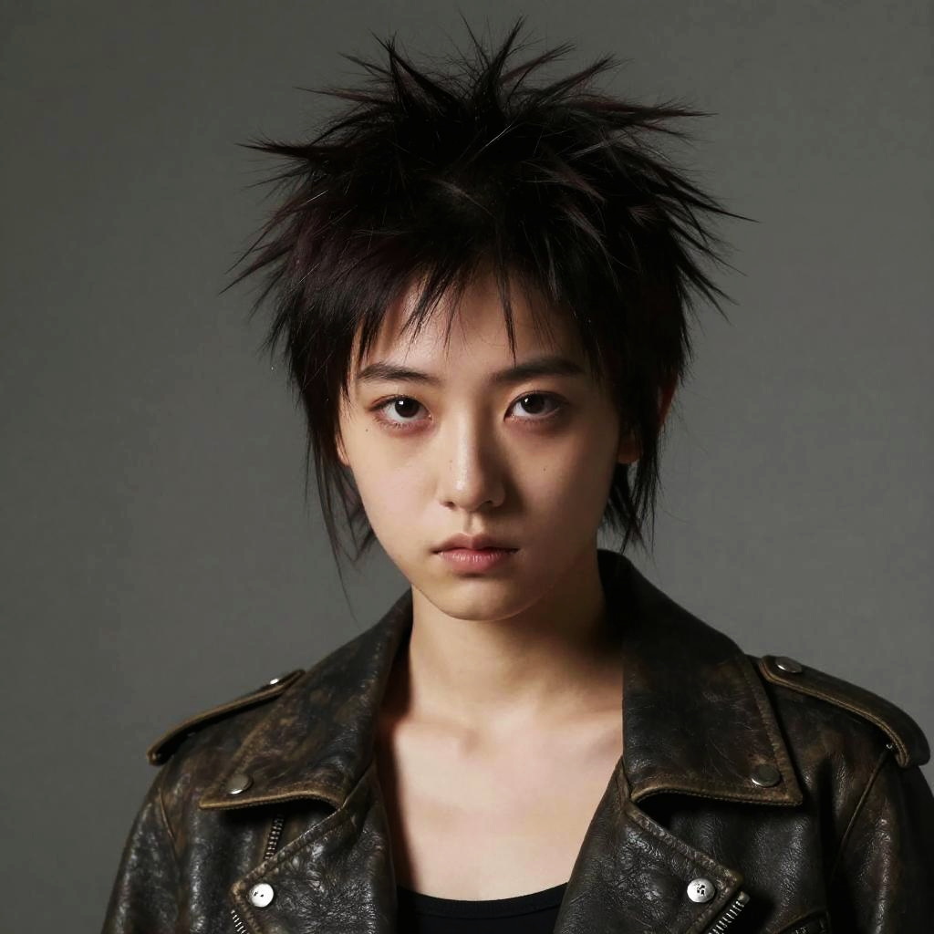 Spiky hairstyles girl wearing leather jacket, rebellious attitude, detailed close-up of hair spikes, muted color palette, soft spotlight highlighting facial features, photo-realistic style.