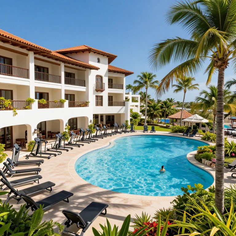 Photograph of a sunny resort pool with curved blue water, white multi-story building, red-tiled roof, black lounge chairs, palm trees, and