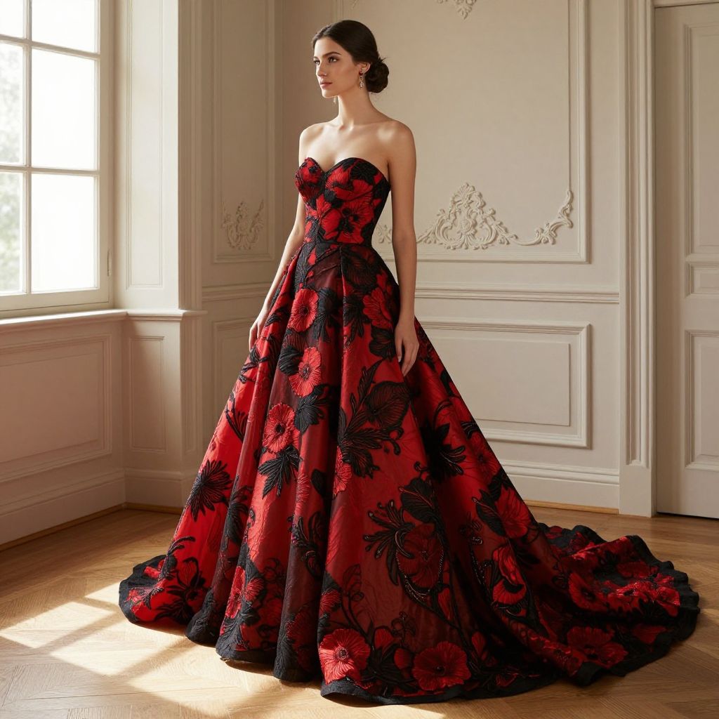 Elegant woman standing gracefully in a stunning strapless red and black floral wedding gown, featuring intricate embroidery and a flowing train, set against a classic interior with ornate paneling and natural light streaming through a window.