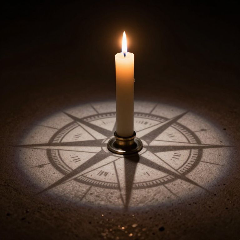 A solitary candle stands luminous against the darkness, its flame casting precise, geometric shadows of a compass-like design onto the textured ground below, defying the logic of natural light sources.