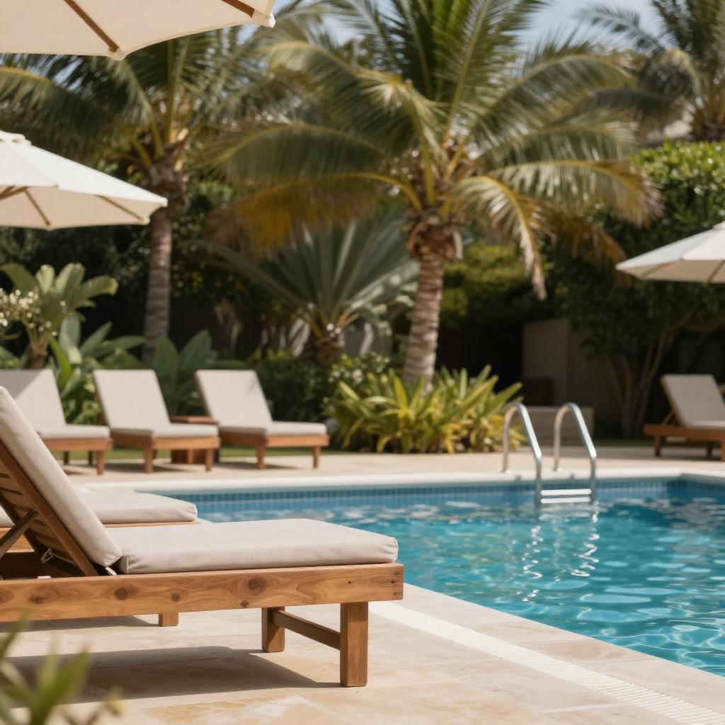 Photograph of a sunny pool scene taken from a low angle. The foreground features wooden lounge chairs with cushions, positioned near the pool's edge. The pool water is a clear blue, with a metal ladder on the right side. The background is lush with green palm trees and shrubs, slightly blurred. Lighting is bright and natural. The depth of field keeps the pool in focus while softly blurring the background.