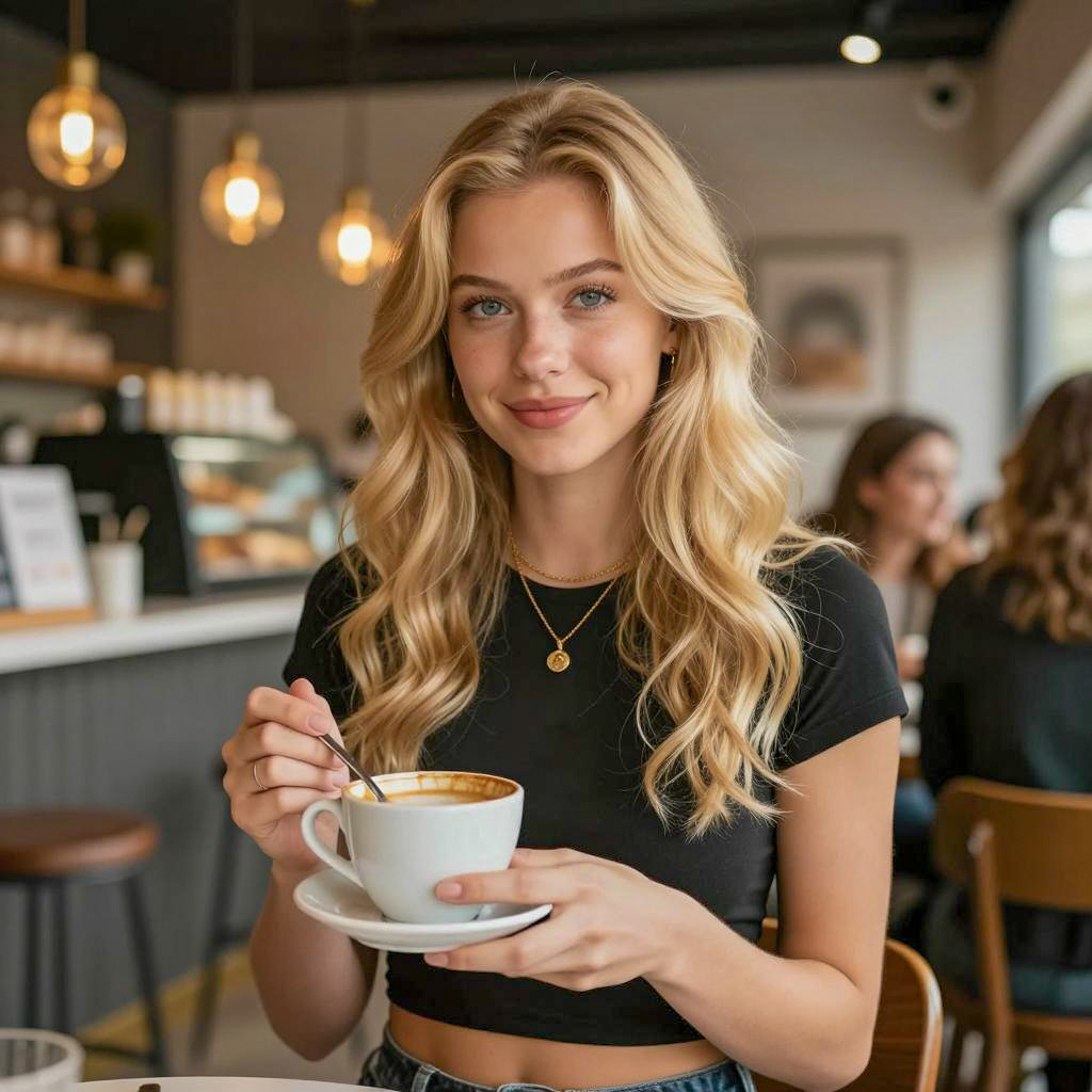 Woman with fair skin, brown wavy hair, wearing a floral patterned dress, holding a decorative cup, sunlight in the background. Light brown eyes, subtle smile. Flower vase with pink flowers on the right, another cup on the table. Sunlight through a window, soft shadows. Realistic photograph.