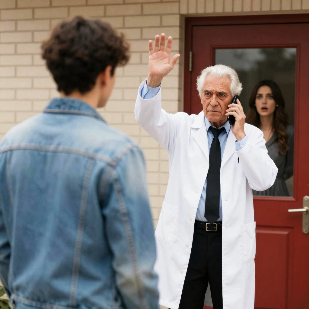 Old man with white hair, white lab coat, black tie, and black pants, holding phone, right arm raised, intense expression. Young man with back to camera, light blue denim jacket, standing in foreground. Woman with long brown hair, reflection in red door, looking surprised. Indoor setting, beige brick wall.