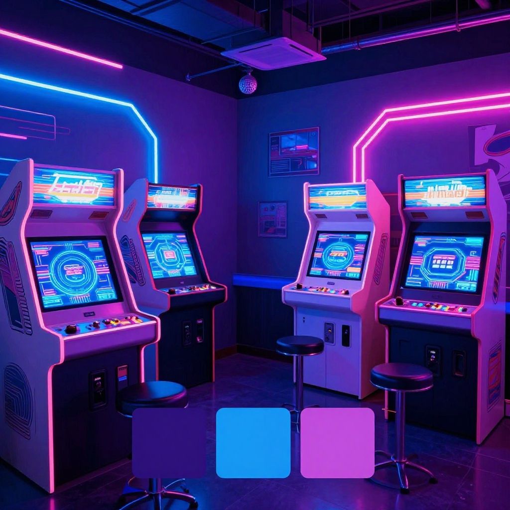 Neon retro color palette applied to an 80s style arcade room, vivid blues, pinks, and purples with glowing game machines, nostalgic atmosphere, synthwave light effects, dynamic composition