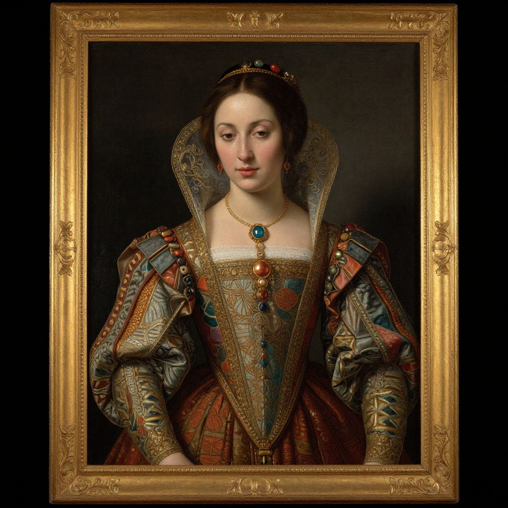 A classical oil painting reminiscent of El Greco's style, featuring a serene portrait of a woman adorned in ornate Renaissance attire, framed by an intricate gold border with a dark background that accentuates her richly detailed garment and composed demeanor.