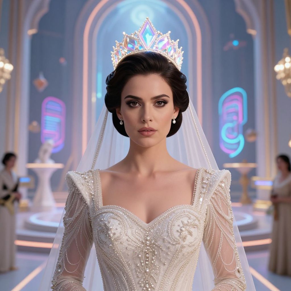 A dramatic wedding ceremony in a futuristic royal palace, where a bride with a sharp, sophisticated elegance wears a queen bridal hairstyle featuring a futuristic holographic crown that pulses with soft light, her face strong and intelligent with dark eyes and a calm expression, standing in a neon-lit hall with floating sculptures and holographic archways, the setting blending fantasy and modern tech with a costume inspired by ancient royalty.