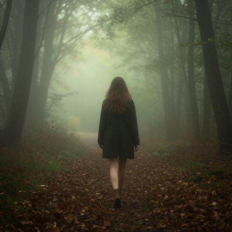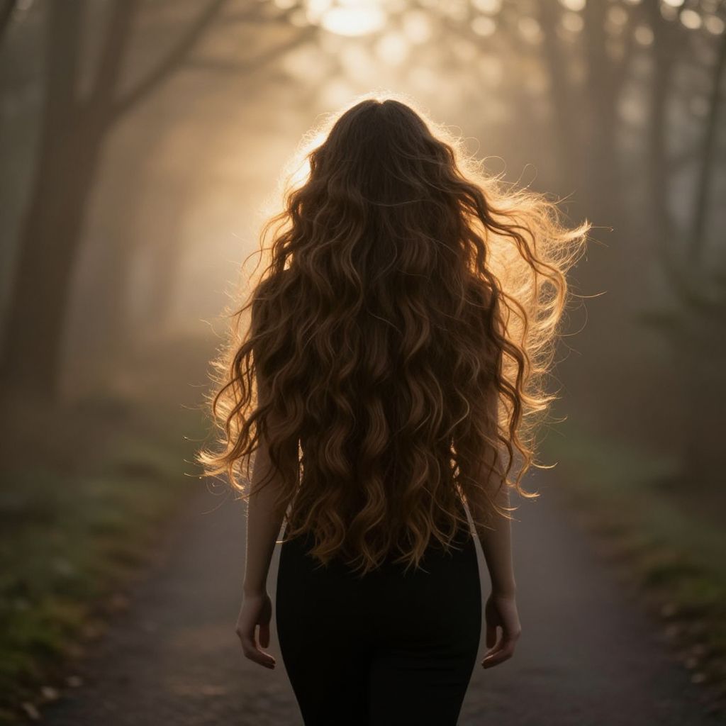 Woman with long, wavy tapered cut hairstyle, flowing and romantic modern look, walking through a misty forest path at dawn, golden light filtering through trees, voluminous hair caught in the wind, natural and authentic aesthetic, cinematic composition, Dall-E style.