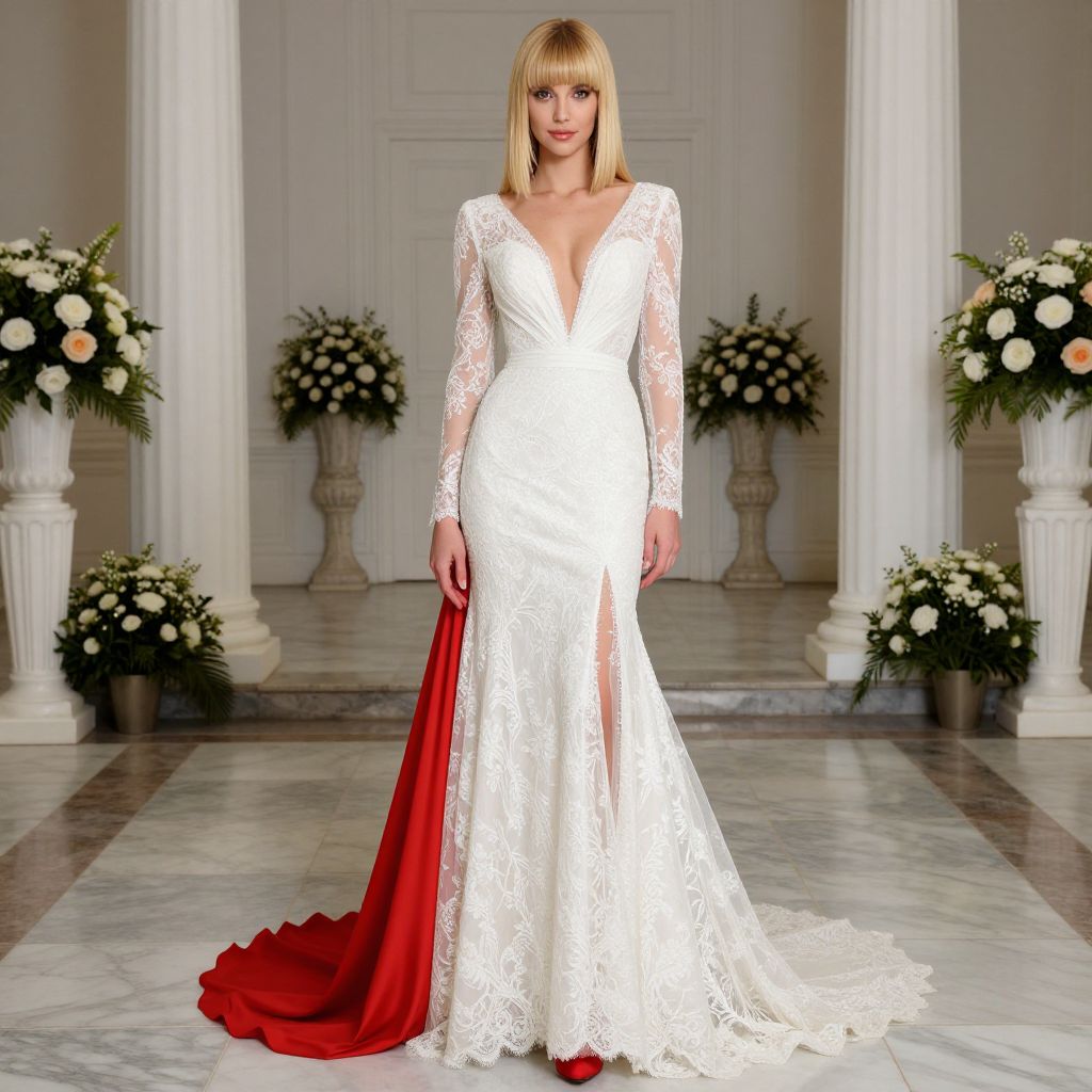 Photograph of a blonde woman with straight bangs in a white lace wedding dress with long sleeves and a deep V-neck, featuring a red satin train