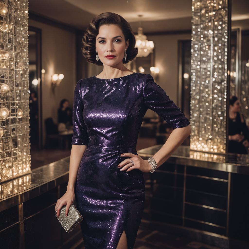 Photo of a Compact Frame woman, Retro Curls, New Year's Eve outfit, elegant sequined dress in Amaranth, form-fitting with Taffeta, high heels in metallic silver, statement jewelry, sparkling earrings, evening clutch, luxury hotel, kodacolor analog film
