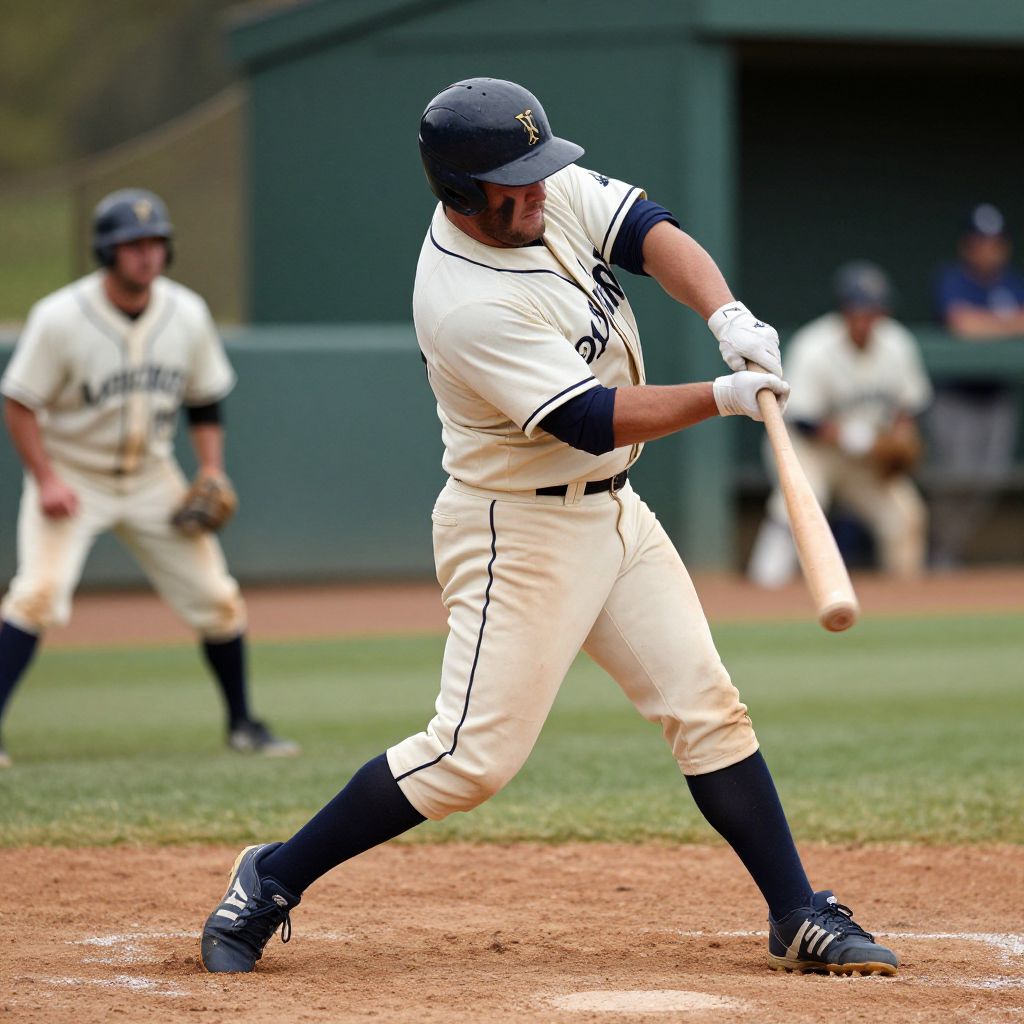 Photograph of a male baseball player in a white and navy uniform, mid-swing, with a blurred teammate in the background.