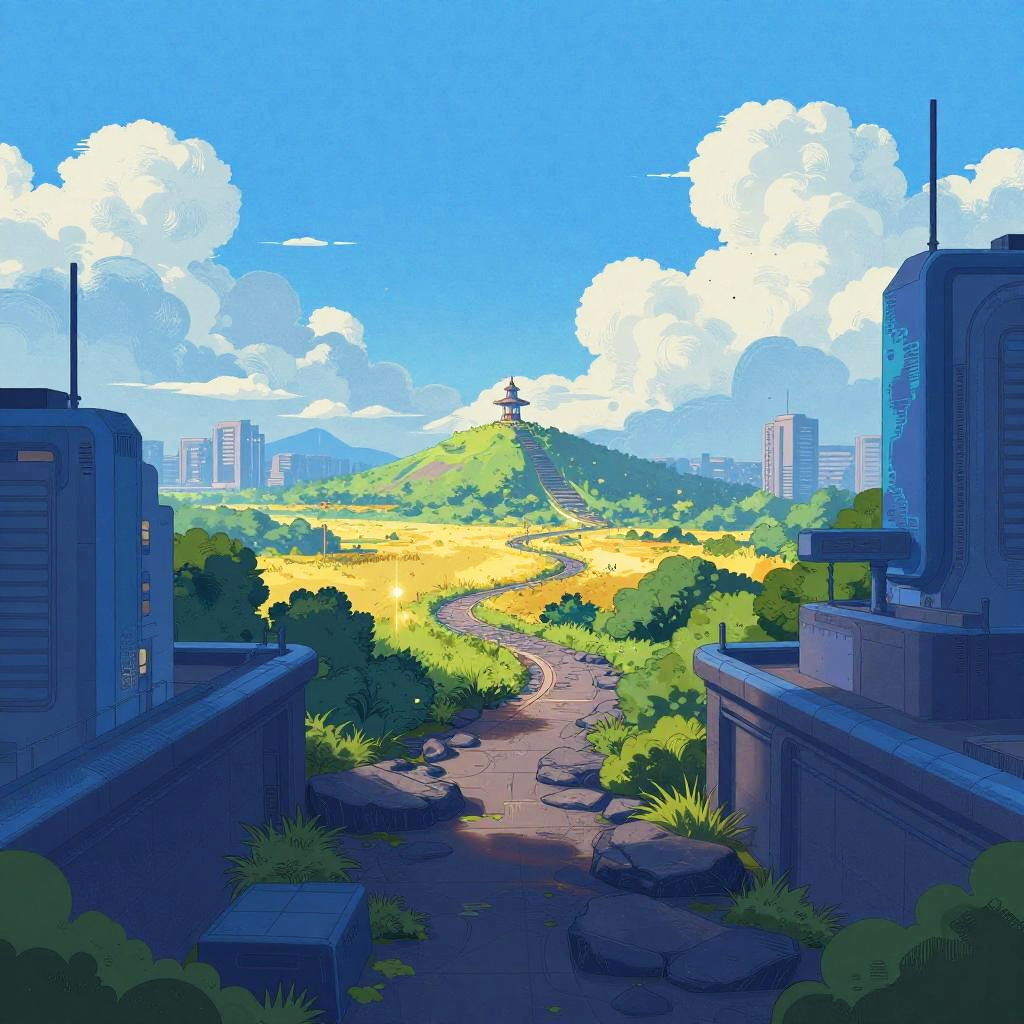 Glitch art landscape set in futuristic city rooftop at twilight, bright blue sky with fluffy clouds. Oversized blue-tinted shapes frame a rocky path winding into a glowing golden field; a small landmark rests on a distant hill amid lush greenery. Saturated palette, crisp outlines, dithered textures, soft bloom, subtle fog, playful particles, storybook charm, edgy and contemplative.