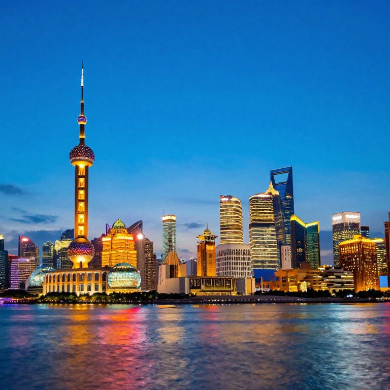 Photograph of a city skyline at sunset with a bright blue sky transitioning to darker shades. The buildings, illuminated in warm golden light, include a tall, illuminated tower on the left. Reflections of the skyline shimmer on the calm water in the foreground. The overall style is vibrant and slightly pixelated, giving it a digital, almost comic-book appearance.