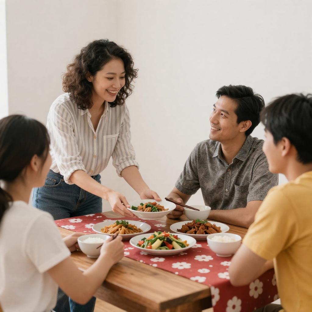 Casual dining scene inside a small, busy Asian restaurant with three people seated at a wooden table enjoying a meal. The woman on the left has short brown hair and wears a gray sweater. The man in the center wears a blue shirt and holds food with chopsticks while looking at the woman. The third person on the right, slightly blurred, is eating with chopsticks. The table is set with various Asian dishes, bowls of rice, and utensils. The background shows white tiled walls, a kitchen counter, colorful food posters, and cooking pots.
