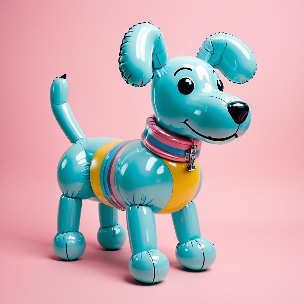 Lowbrow art of a balloon animal dog, influenced by Jeff Koons, with bright playful fairground vibe, pastel color palette, exaggerated proportions, and a humorous tone