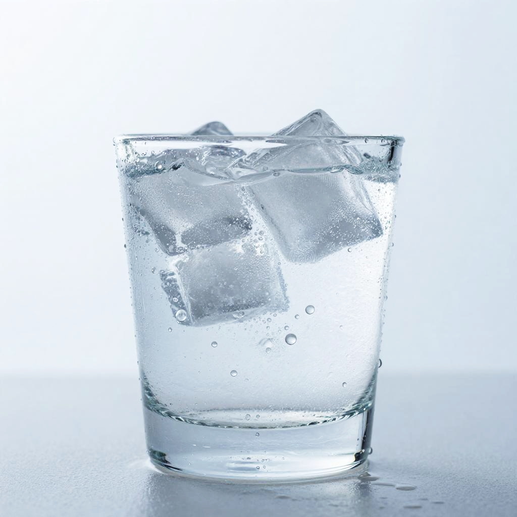Verre : a crystal glass filled with sparkling water and ice cubes, condensation on the surface, minimalistic background, cold shades of blue and white, highly detailed and realistic