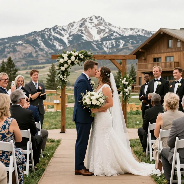 Photograph of a bride and groom kissing at an outdoor mountain wedding, surrounded by guests, floral arch, and wooden structure.