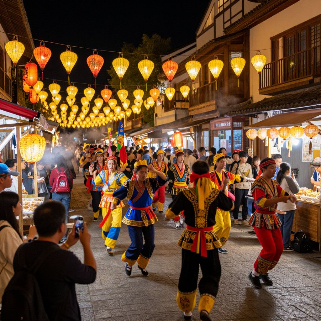 Mito festival at night, vibrant lanterns illuminating streets filled with traditional dancers in colorful costumes, steam rising from food stalls, excited crowd watching parade, dynamic movement and joyous mood, rich cultural expression