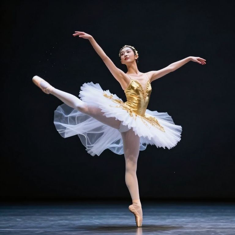 A graceful ballerina leaps midair, her form illuminated by dramatic lighting as she wears a shimmering gold bodice and a flowing white tutu that billows around her like liquid stardust, creating a celestial visual effect against the dark backdrop.