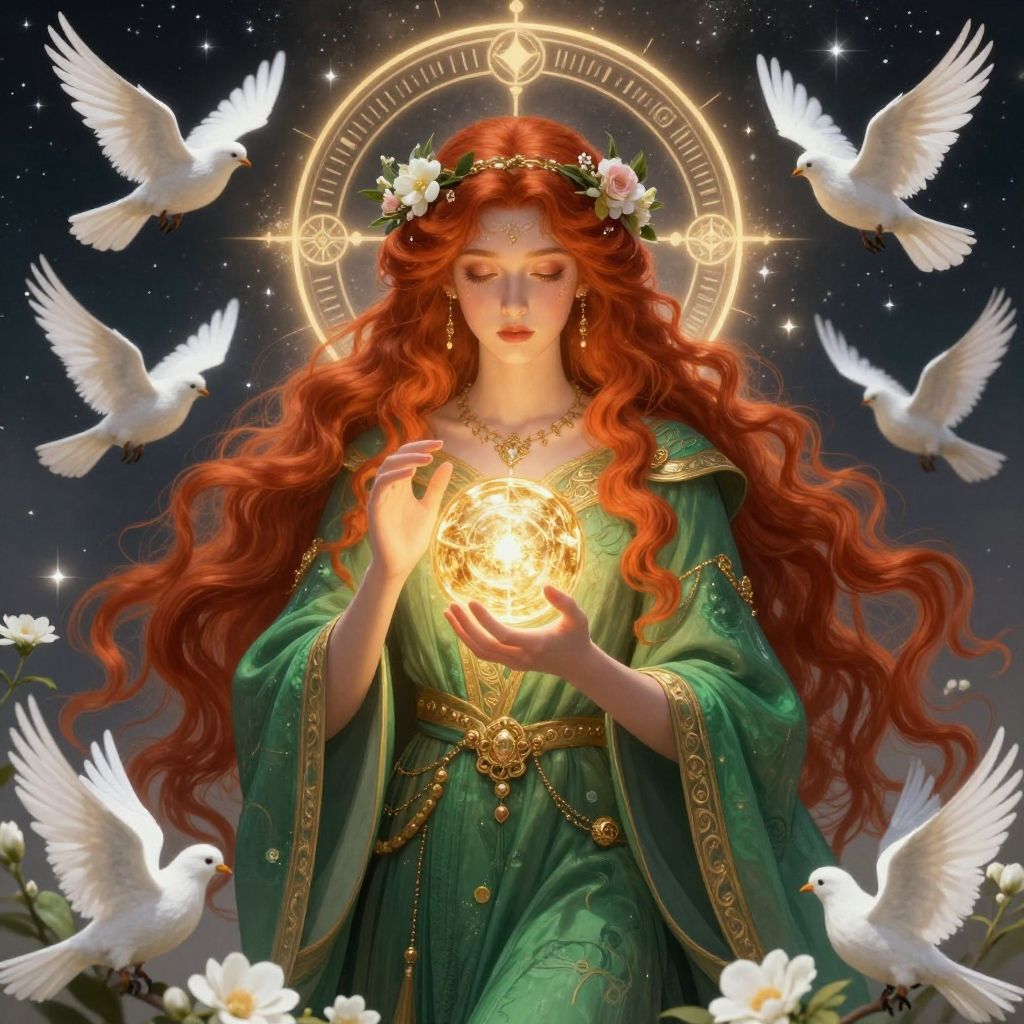Devotion depicted as a radiant figure embracing a glowing heart, surrounded by soft golden light and ethereal flowers, conveying deep commitment and emotional warmth in a serene natural setting, digital painting style.