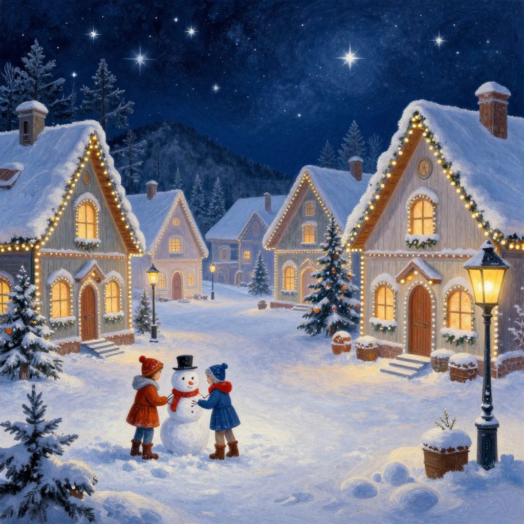 Navideños snowy village scene with traditional houses adorned with bright Christmas lights, children building a snowman, starry night sky, frosty windows, glowing lanterns on lampposts, whimsical and nostalgic holiday spirit in a painterly winter landscape