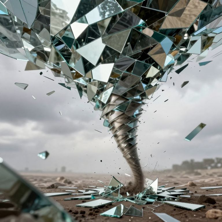Photograph of a surreal scene featuring a tornado composed of shattered glass pieces. The tornado twists upward from a dusty, barren landscape under a cloudy sky. The glass fragments, in various sizes and reflective surfaces, create a dynamic, chaotic pattern against the muted background. The tornado's center appears dark and swirling, contrasting with the bright, fragmented edges of the glass. The ground is covered in small rocks and dirt, adding to the desolate atmosphere. The overall composition is striking, blending natural and abstract elements to evoke a sense of destruction and turmoil.