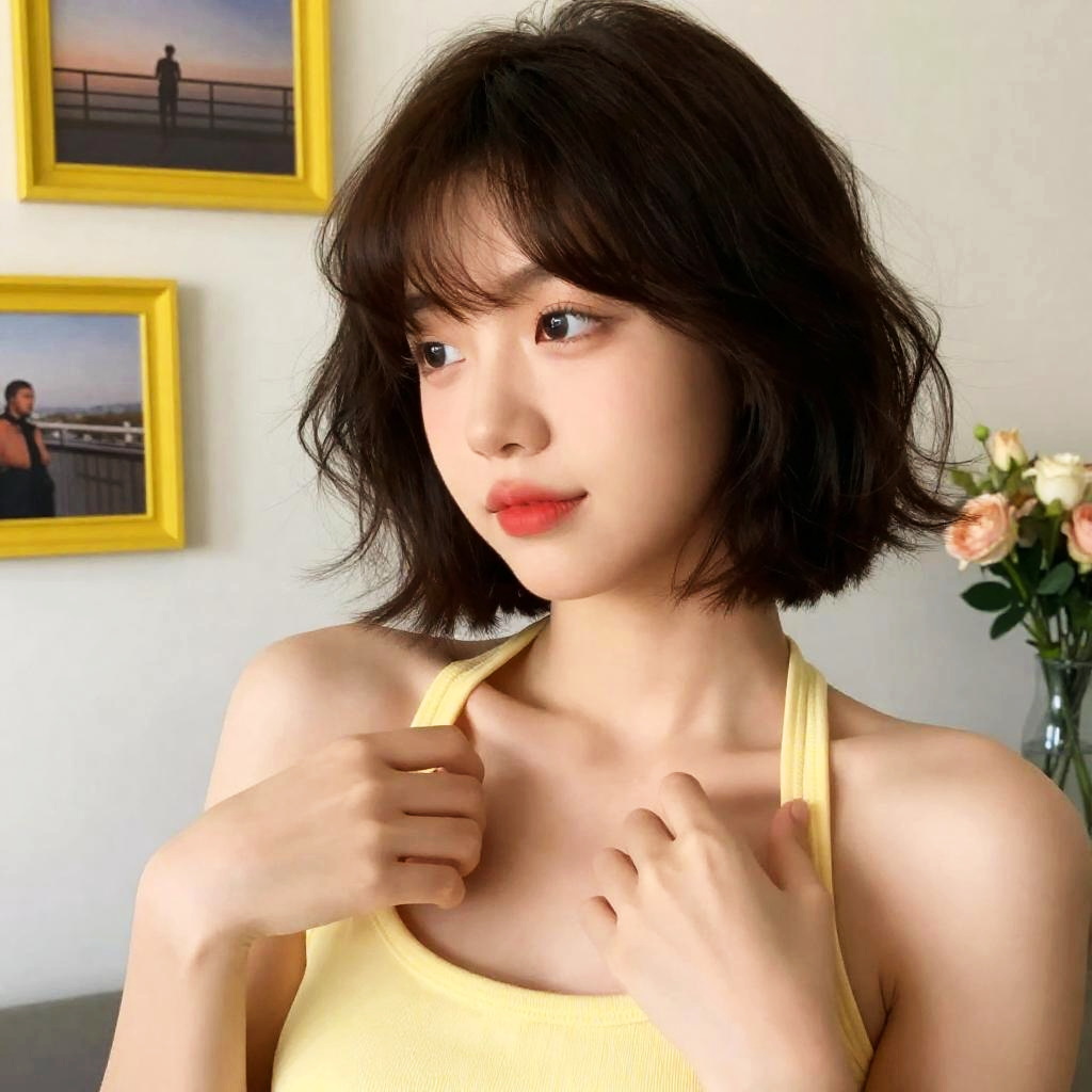 Photograph of a young woman with a dark brown bob haircut, wearing a yellow halter top. She has light skin, red lipstick, and is looking to the left with a slight smile. Her hands are near her collarbone. Background includes yellow-framed pictures and a floral arrangement.