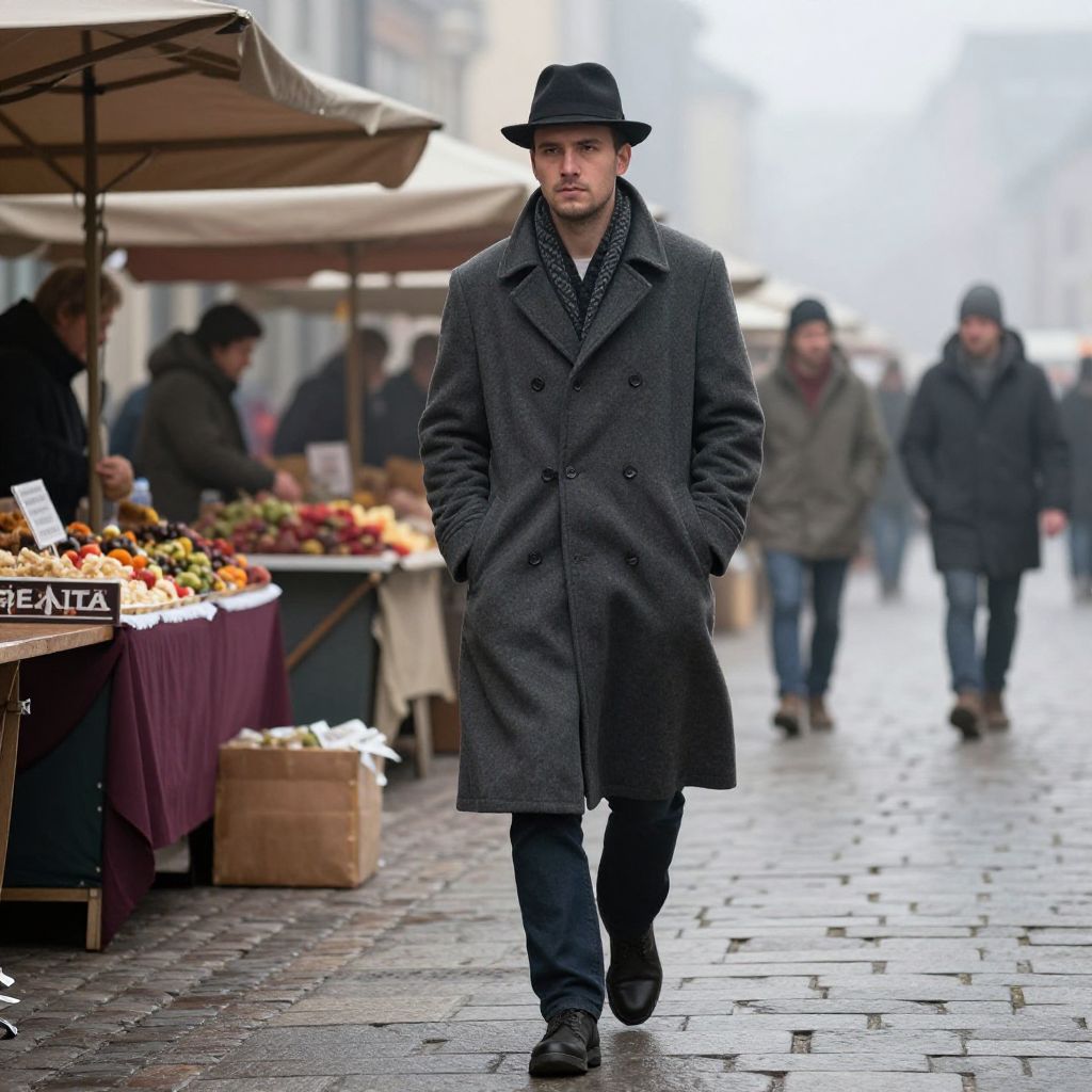 Red Highlights, fit european man, walking through a historic street, autumn leaves falling, warm tones, detailed clothing, mid-40s age, professional portrait photography