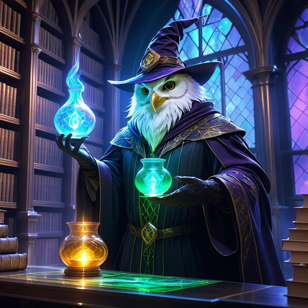Anthropomorphic owl wizard brewing a potion in a tower library. Styled as cinematic Magic: The Gathering artwork with volumetric lighting by Artgerm.