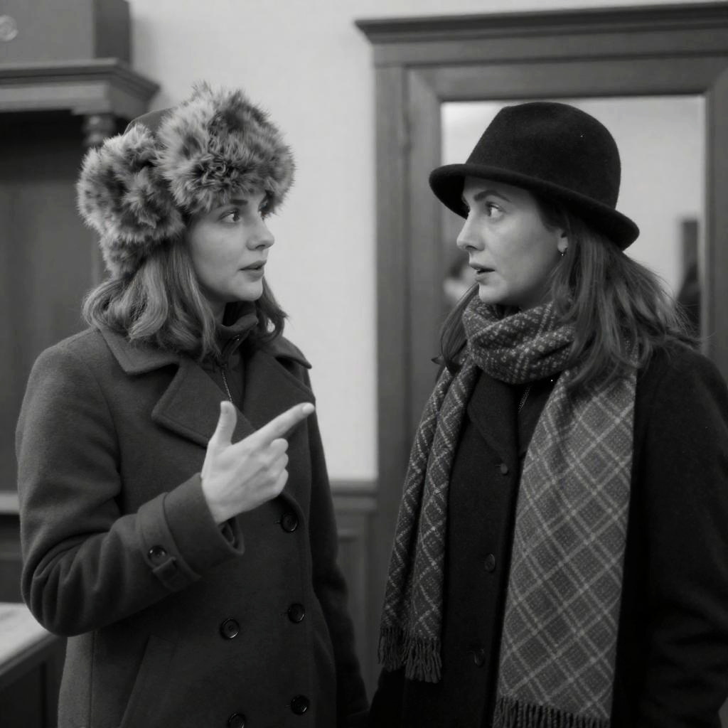 Black-and-white photograph of two women in winter clothing. Left woman wears curly fur hat, dark coat, and makes a hand gesture. Right woman has dark hat, patterned scarf, and looks to the left with surprise. Indoor setting with wooden furniture and mirror in background. Both women have fair skin. Left woman has medium-length hair, right woman has long hair. Women stand facing each other, slightly turned.