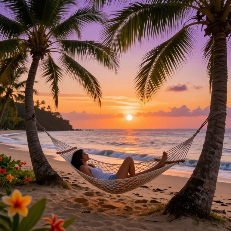 Chiling on a tropical beach at sunset, lounging on a hammock between palm trees, soft waves gently lapping the shore, vibrant orange and purple sky, exotic flowers blooming around, serene and relaxing mood, photorealistic tropical paradise environment.