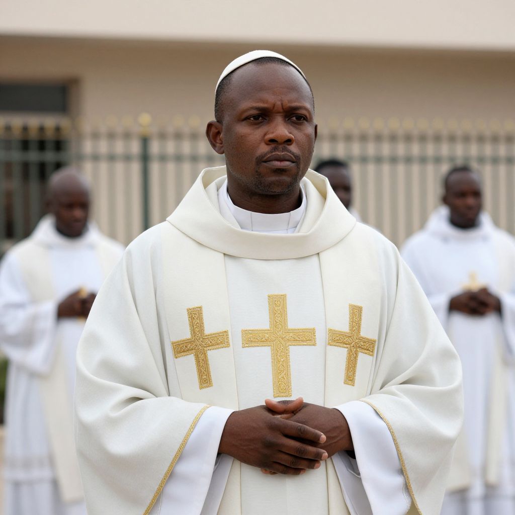 Photograph of a serious-looking African-American male clergyman standing outdoors. He's wearing a white robe with gold embroidered crosses and a matching white zucchetto. His dark skin contrasts with the bright white and gold of his attire. The blurred background includes other clergy members in similar white robes and a beige building with a metal fence.