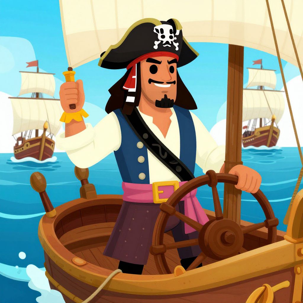 Colorful digital cartoon of a smiling pirate with black hat and skull emblem, holding a gun, steering a wooden ship. Background features blue sky and sailing