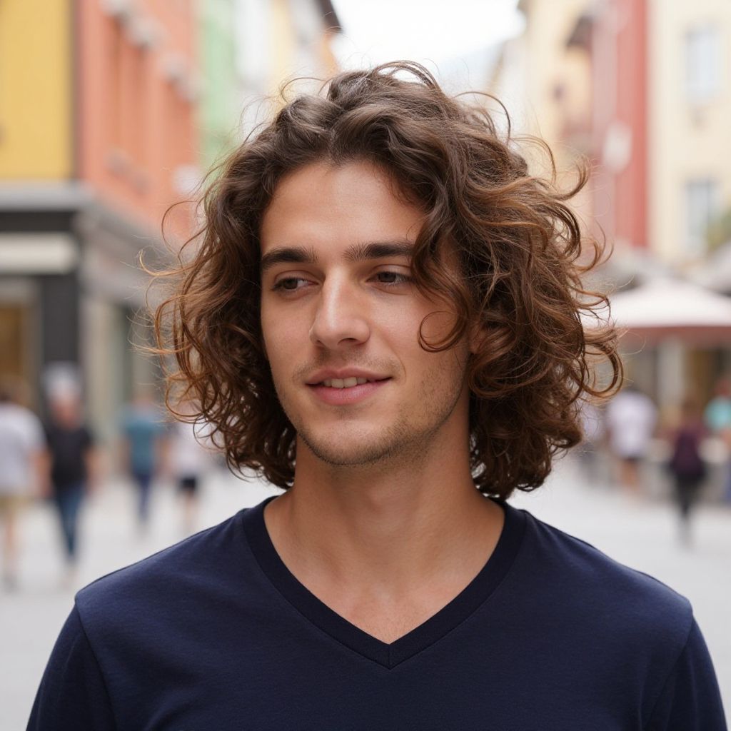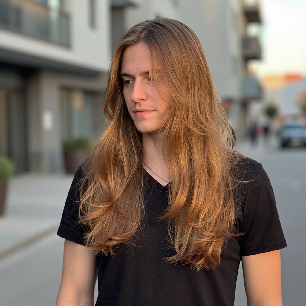 Caramel Highlights, fit European man, street style photography, golden hour light, relaxed pose, modern urban backdrop, sharp focus on hair texture, realistic skin tones