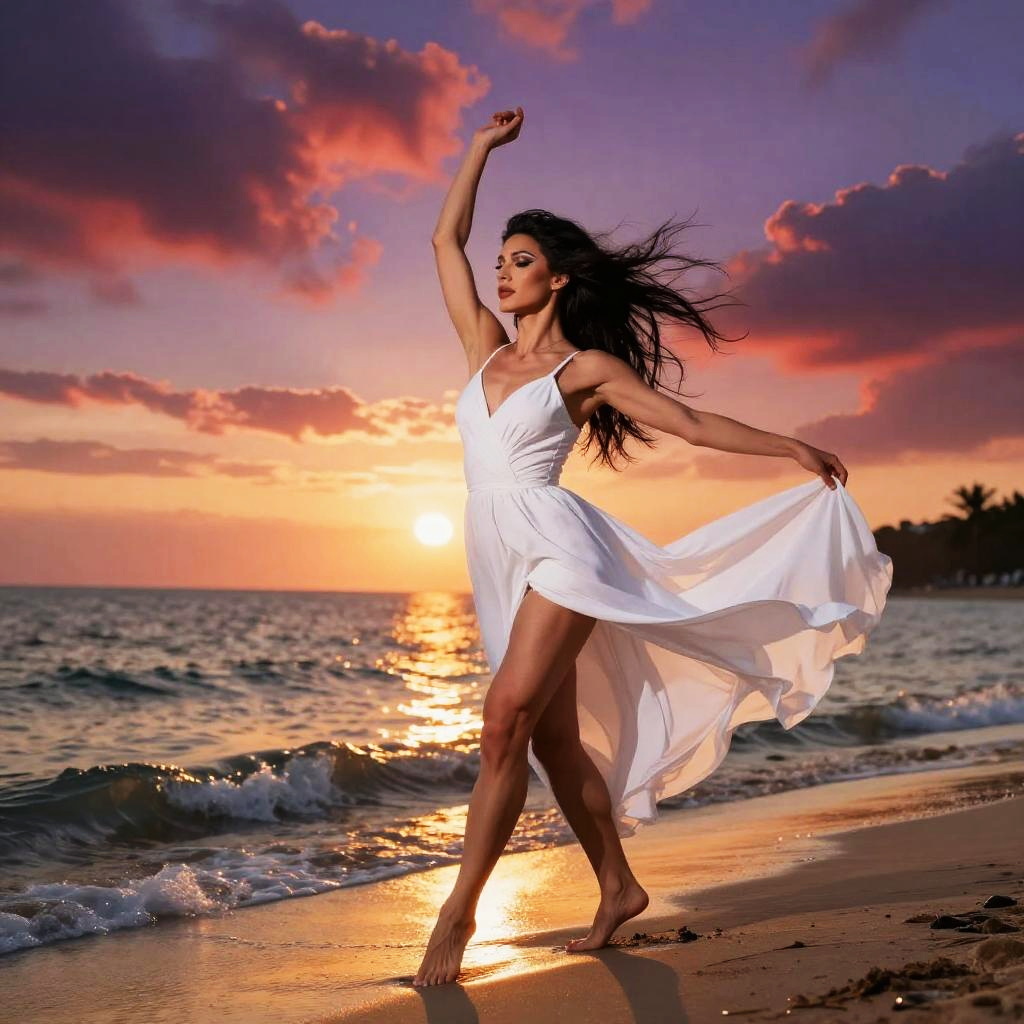 Free-spirited bohemian man playing guitar, beach at sunset, sunset concert vibe, warm golden hues reflecting on the water, soft waves gently lapping at the shore, flowing white dress, curly brown hair blowing in the wind, vibrant sky painted with shades of red and purple, ethereal atmosphere, highly detailed, capturing the essence of freedom and joy, 4K resolution, serene and blissful ambiance.