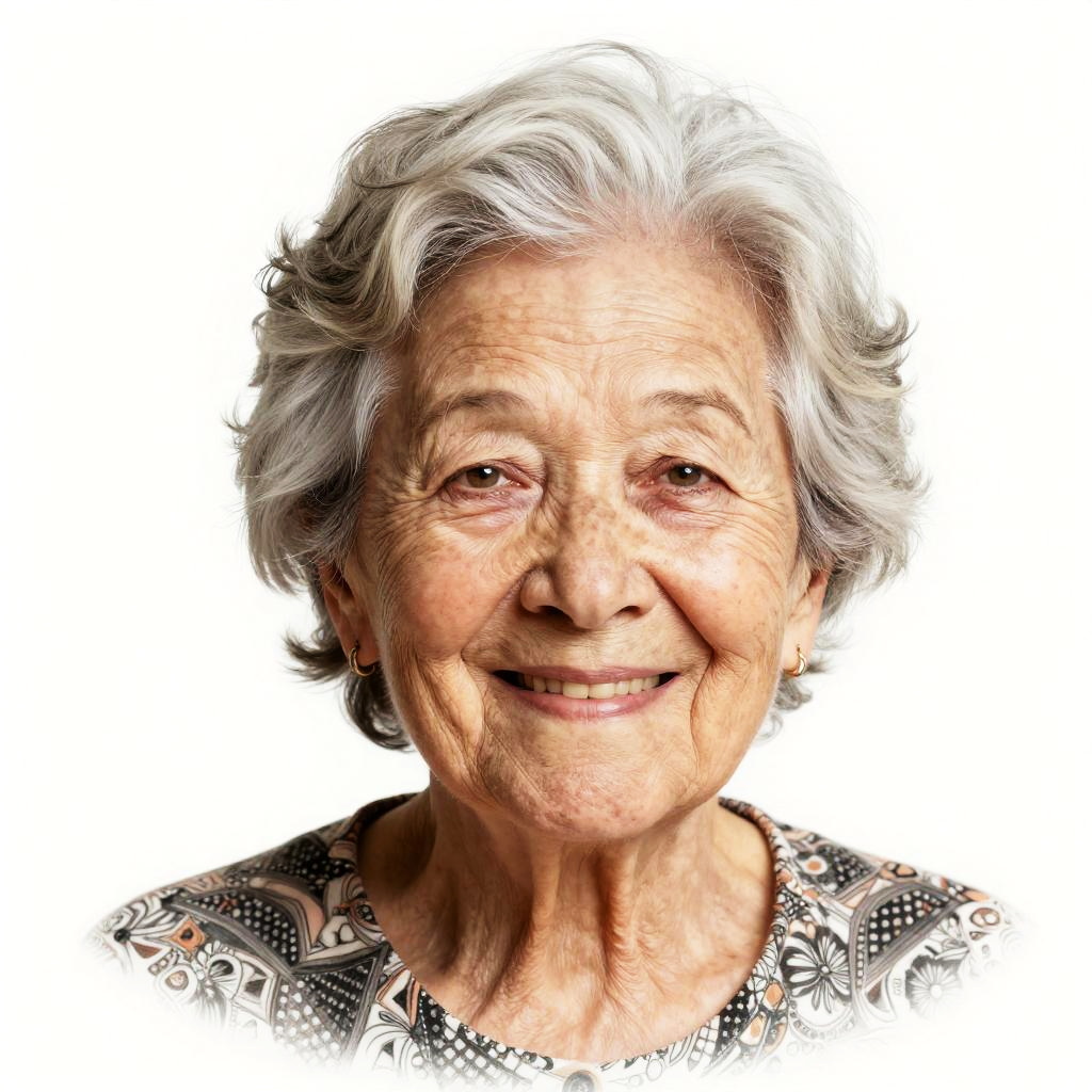 Age generator photo transformation showing a young woman morphing gracefully into an elderly version of herself with detailed wrinkles, silver hair, realistic skin texture, and soft natural lighting in a studio setting.