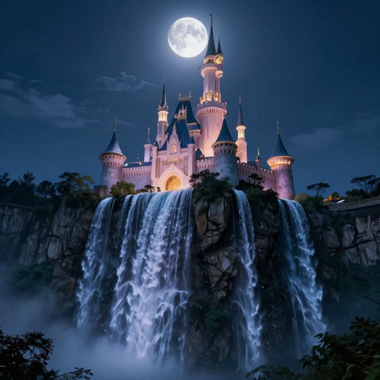 Photograph of a fairy-tale castle illuminated by moonlight, perched atop a majestic waterfall with glowing blue water, surrounded by dark trees and mist