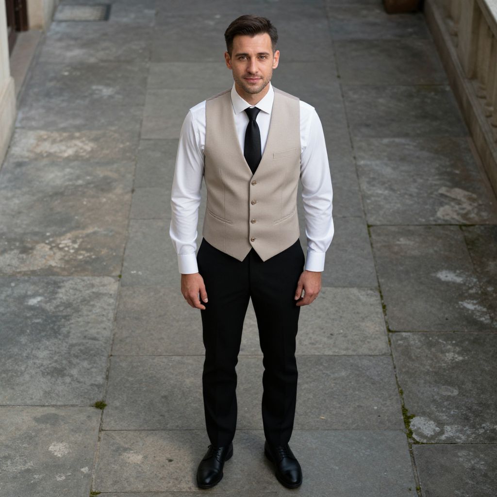 Confident Man in Beige Vest on Stone Floor